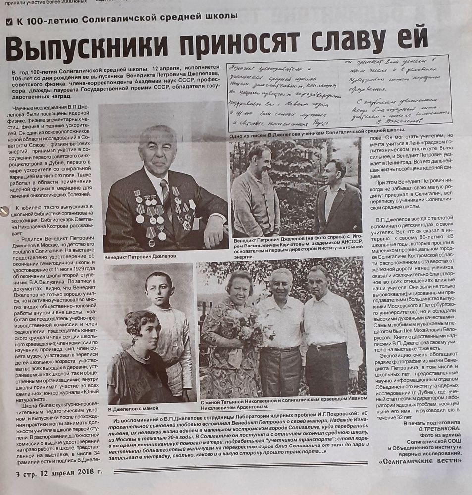 Статья в газете "Солигаличские вести" к 100-летию Солигаличской средней школы