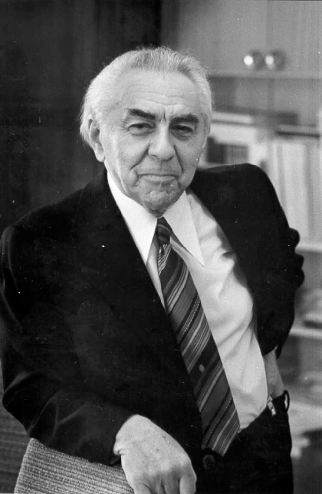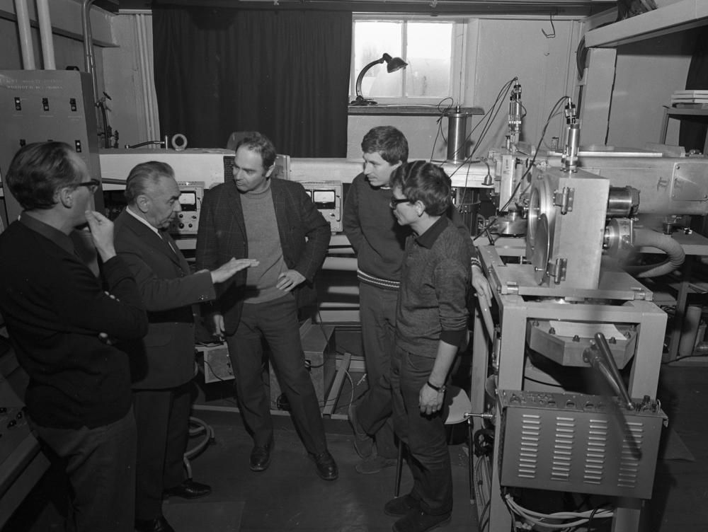 Беседуют (слева направо): В. П. Джелепов, Ю. А. Будагов, В. С. Роганов. 1975 год