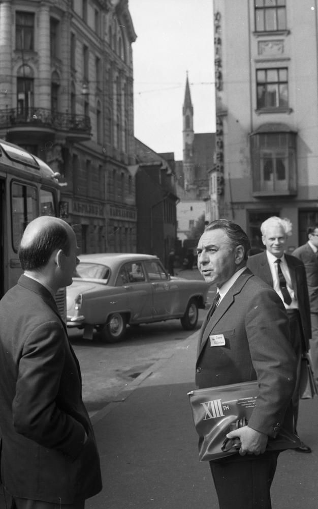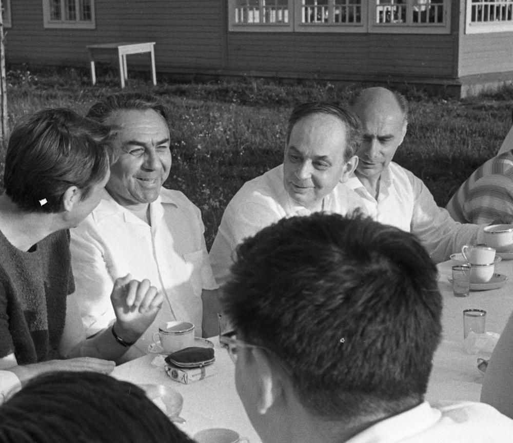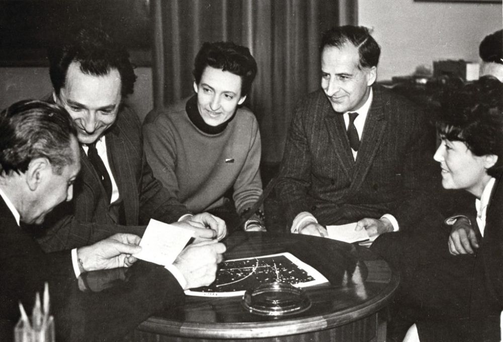 За столом сидят (слева направо): В. П. Джелепов, Я. А. Смородинский, Ж. Лаберриг-Фролова, Б. М. Понтекорво, И. Г. Покровская, ОИЯИ, 1964 год